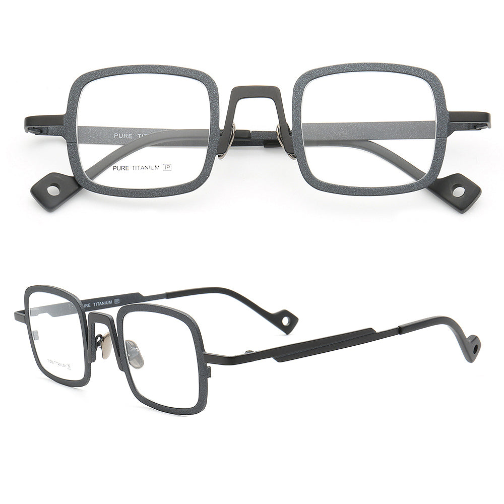 These retro square eyeglasses are made of pure titanium material. They come in blue, red/brown, green/grey, and gunmetal/black color options. The unisex design allows these glasses to be worn by both men and women.