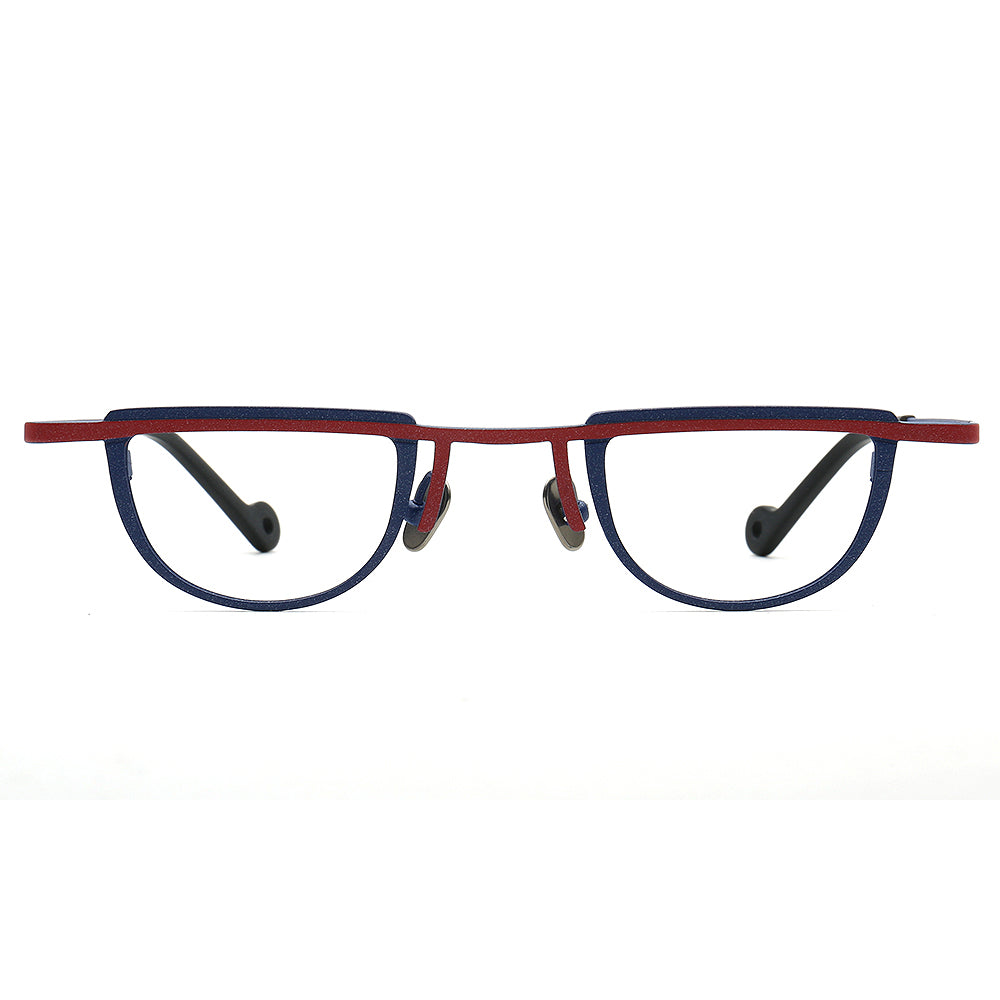 These fashionable, small geometric eyeglass frames are made of pure titanium material. They come in black/gunmetal, navy/red, black/yellow and green/orange color options. The narrow unique design allows these glasses to be worn by both men and women.