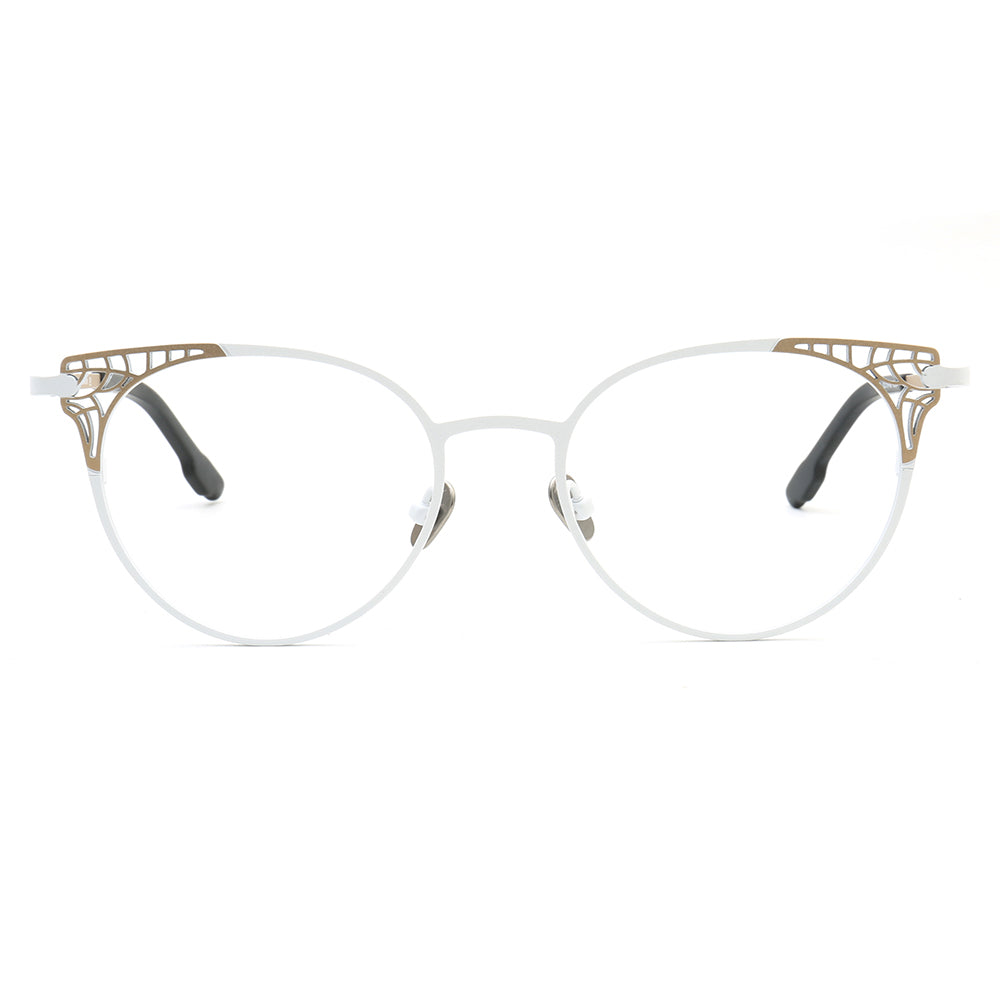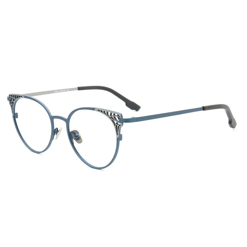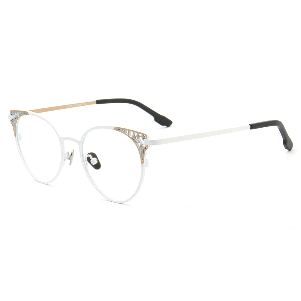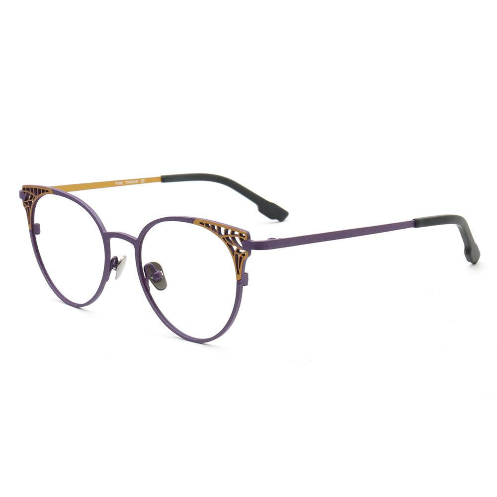 These cat eye eyeglasses are made of pure titanium material. They come in blue, purple, brown, and white color options. The cat eye shape makes these most suitable for women.