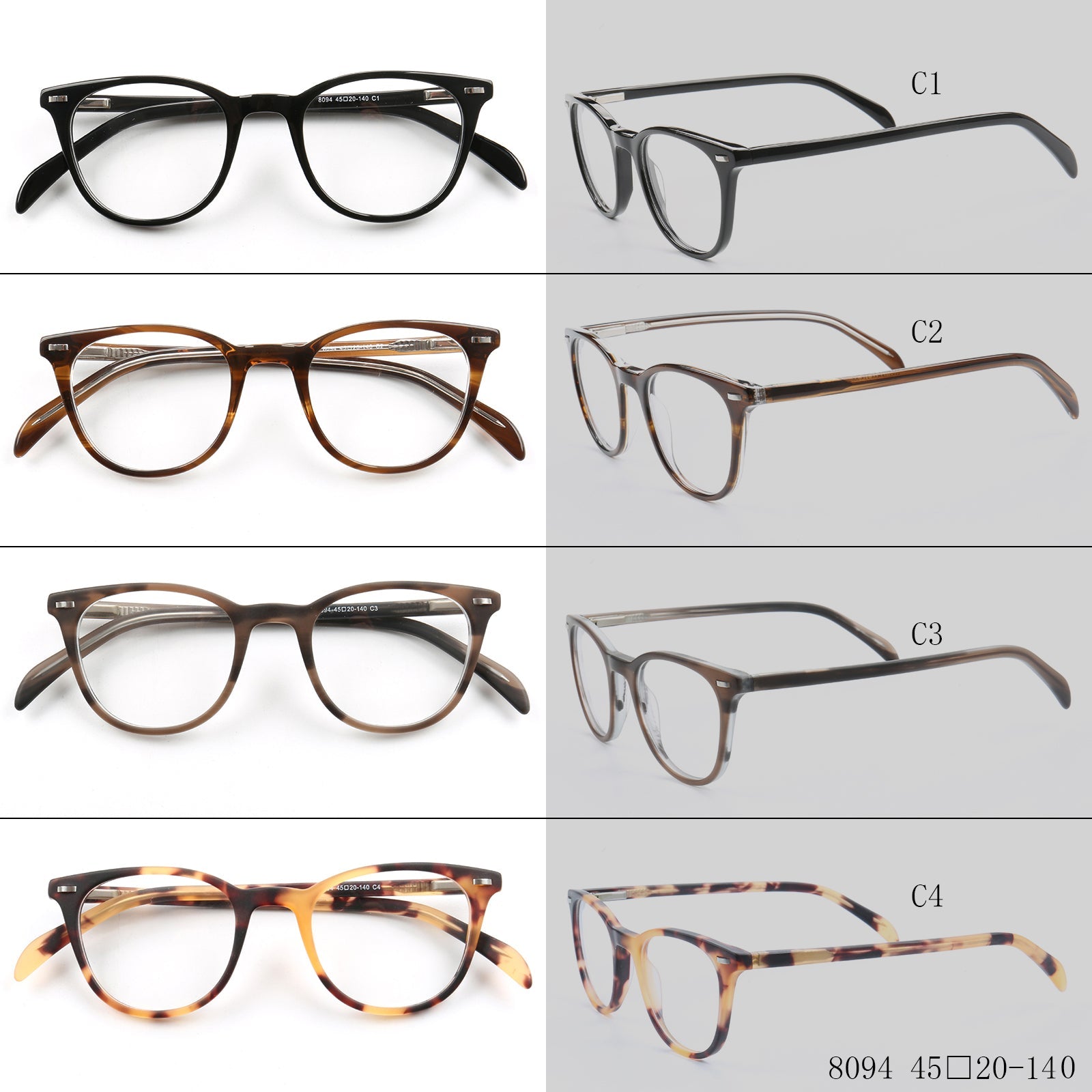 These round eyeglasses are made of acetate material. They come in black, brown, and tortoise color options. The unisex design allows these glasses to be worn by both men and women.