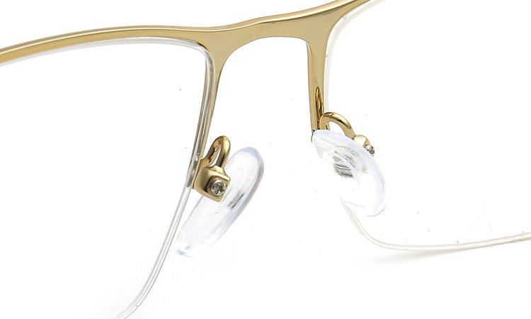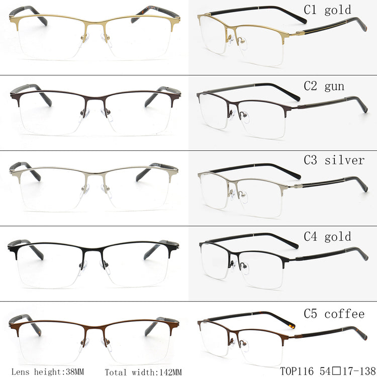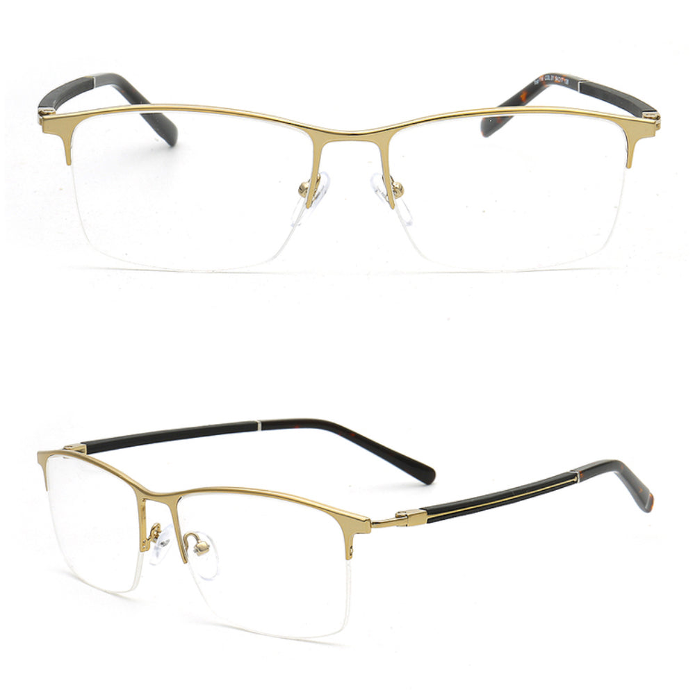 These lightweight half rim eyeglasses frames are made of metal material with rectangle shape. They come in black, silver, gold, gunmetal, and coffee color options. The classic semi rimless design allows these eyewear frames to be worn by men of any ages. These spectacles are suitable for both business and casual wear.