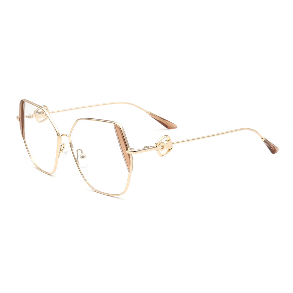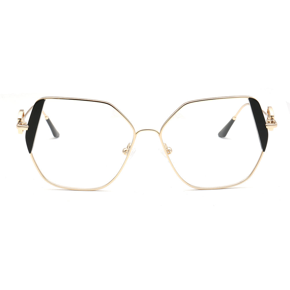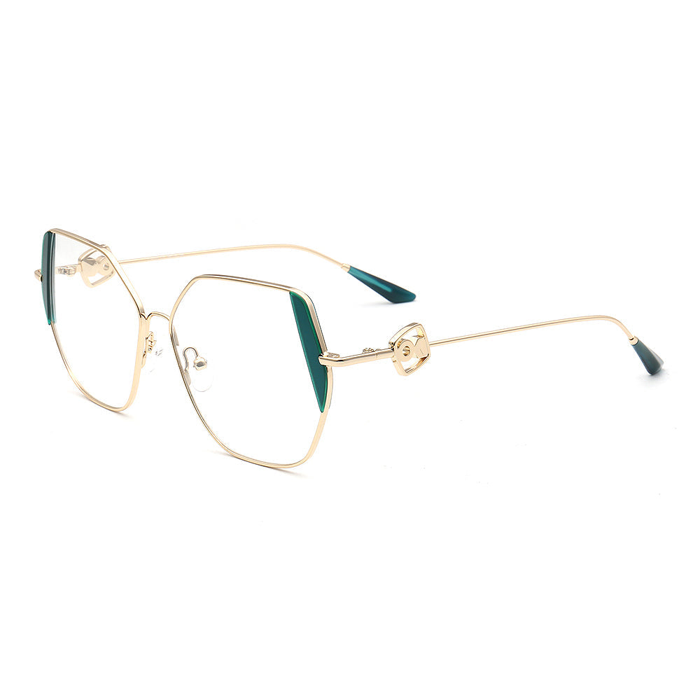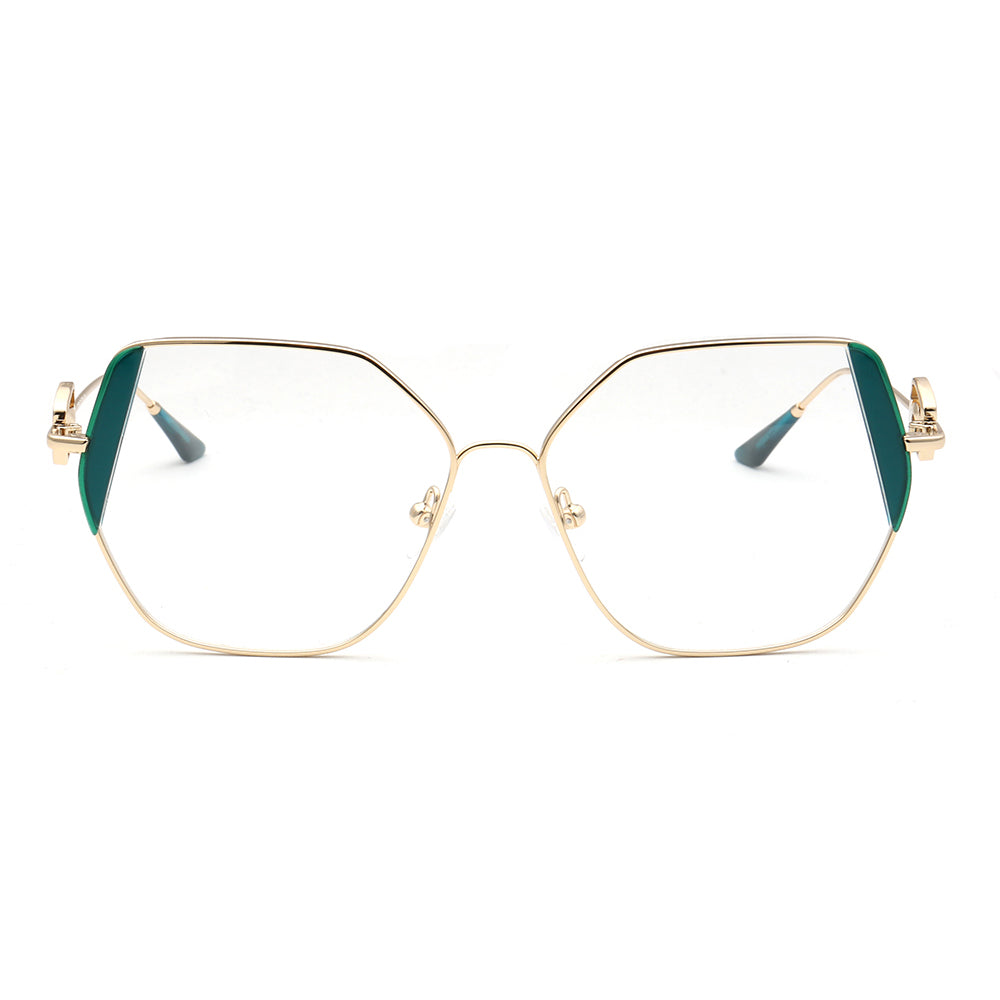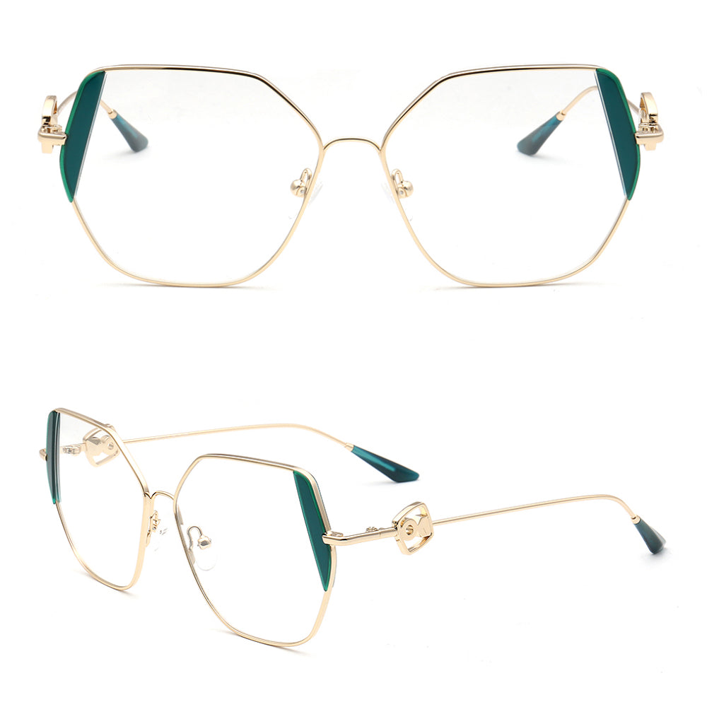 These trendy eyeglasses frames are made of metal material, which is very lightweight. The spectacles come in flesh, green, brown, black, red, tea, blue and teal color options with gold frames. The stylish geometric and oversized frame design allows these eyewear frames to be worn by women of any age.