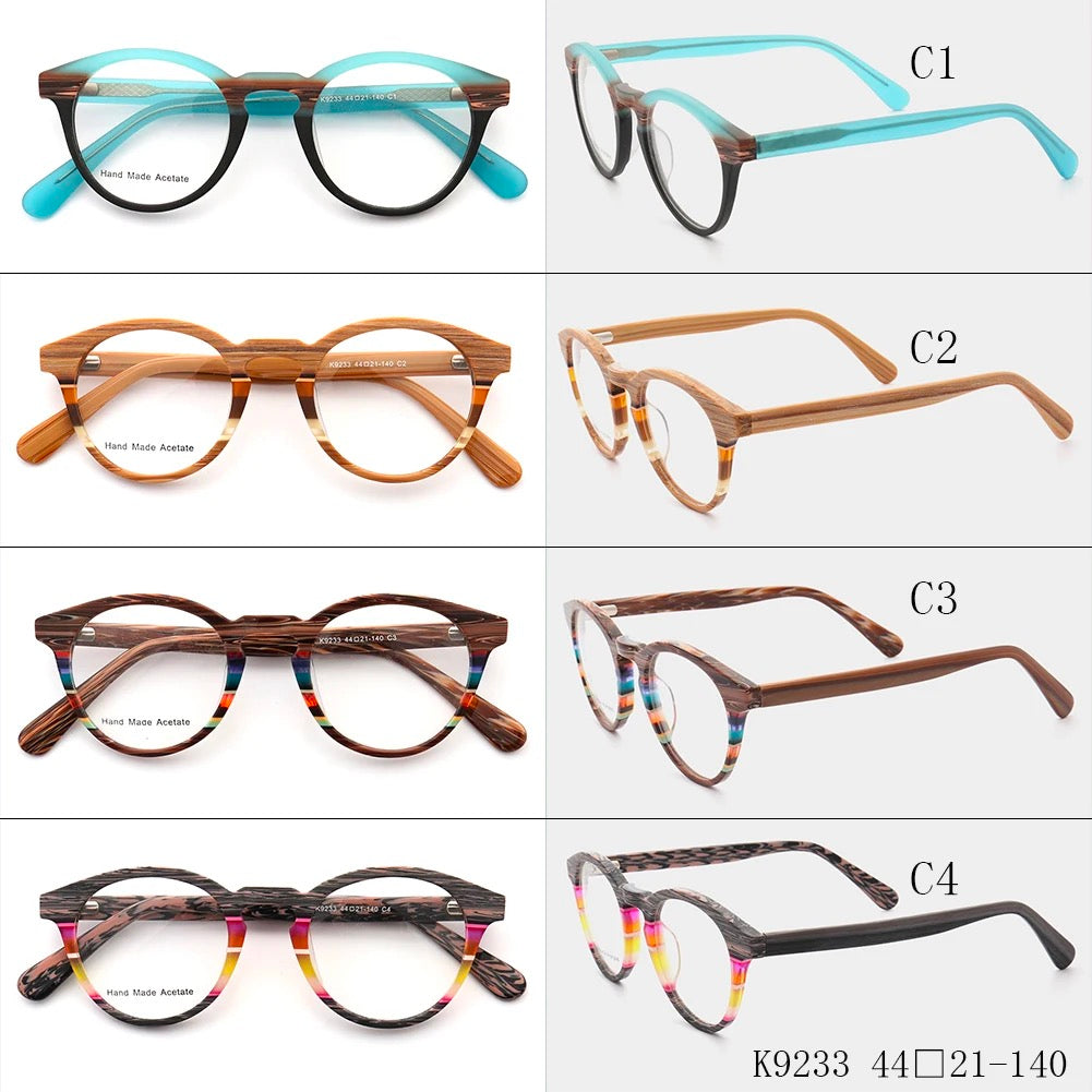 These round eyeglasses are made of acetate material. They come in blue, wood grain, brown, and multicolor color options. The unisex design allows these glasses to be worn by both men and women.