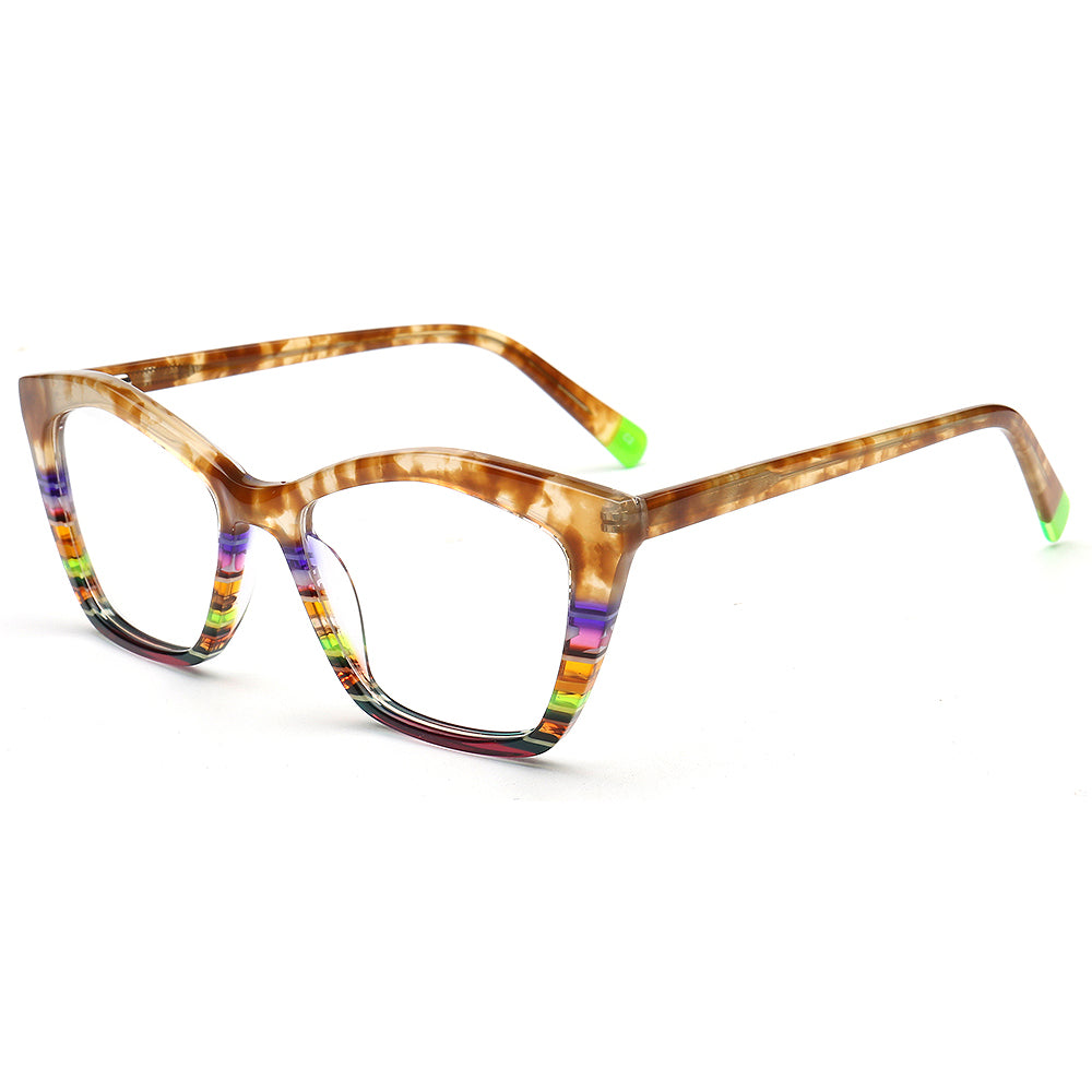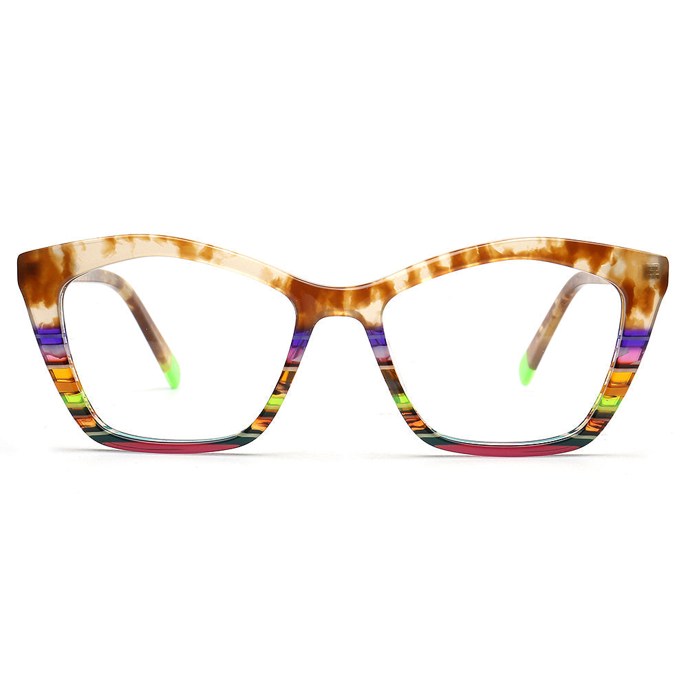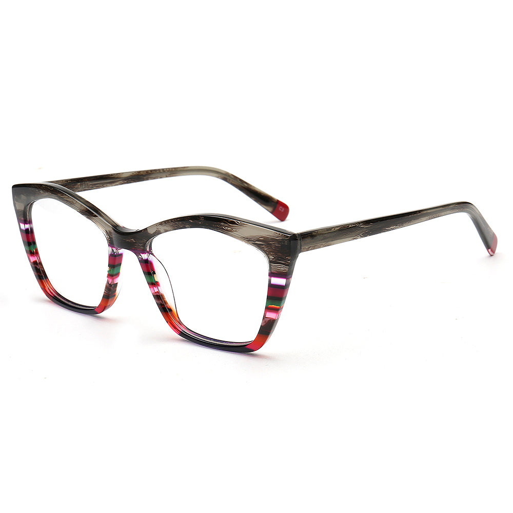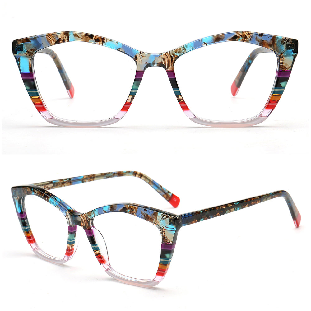 These fashionable cat eye spectacles are made of acetate material. Durability is a significant factor when choosing eyeglasses frames, and acetate frames do not disappoint. The material's strength means it can withstand daily wear and tear, reducing the need for frequent replacements. These chic eyeglasses frames come in striped design with multicolor color options. The trendy cat eye and colorful design allows these eyeglass frames to be worn by women of any ages.