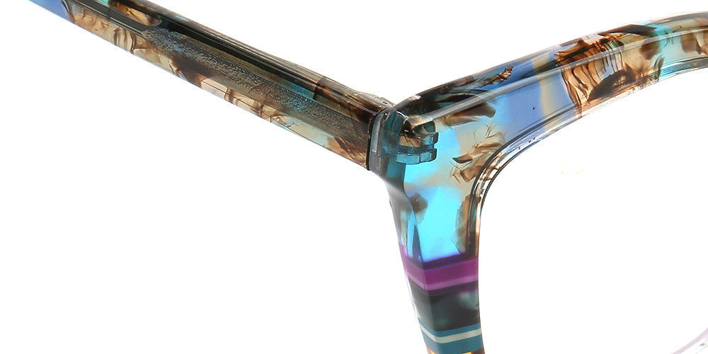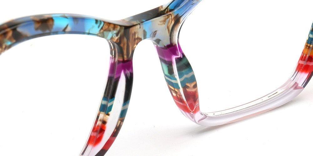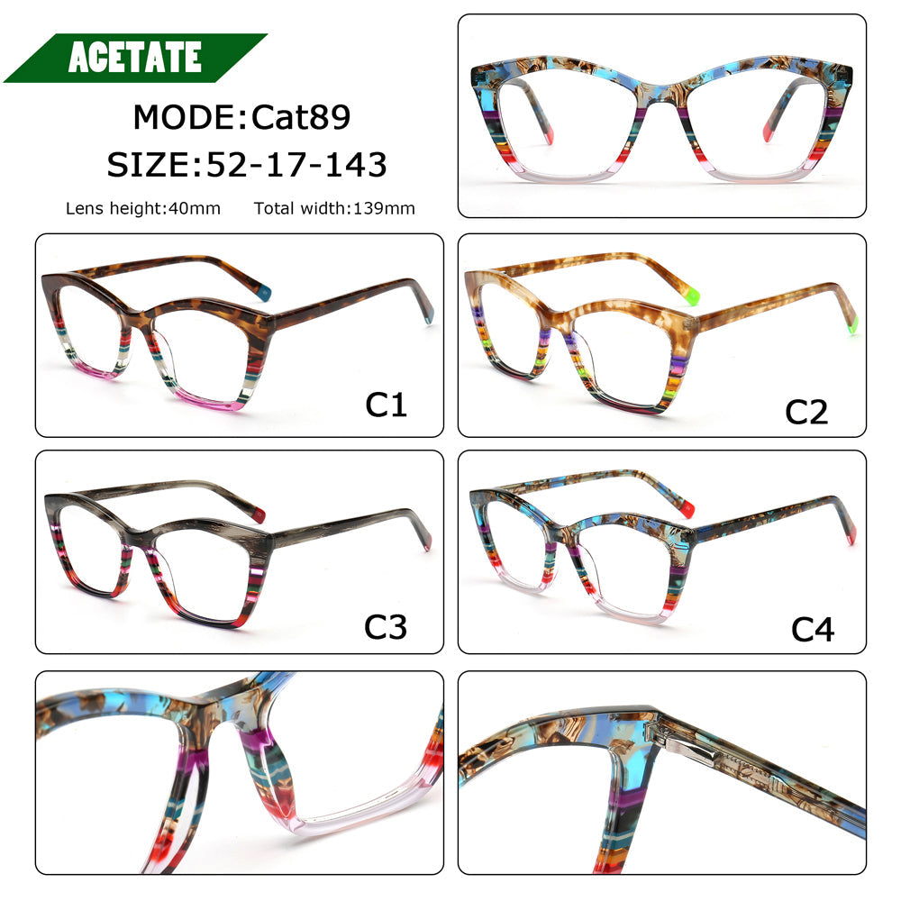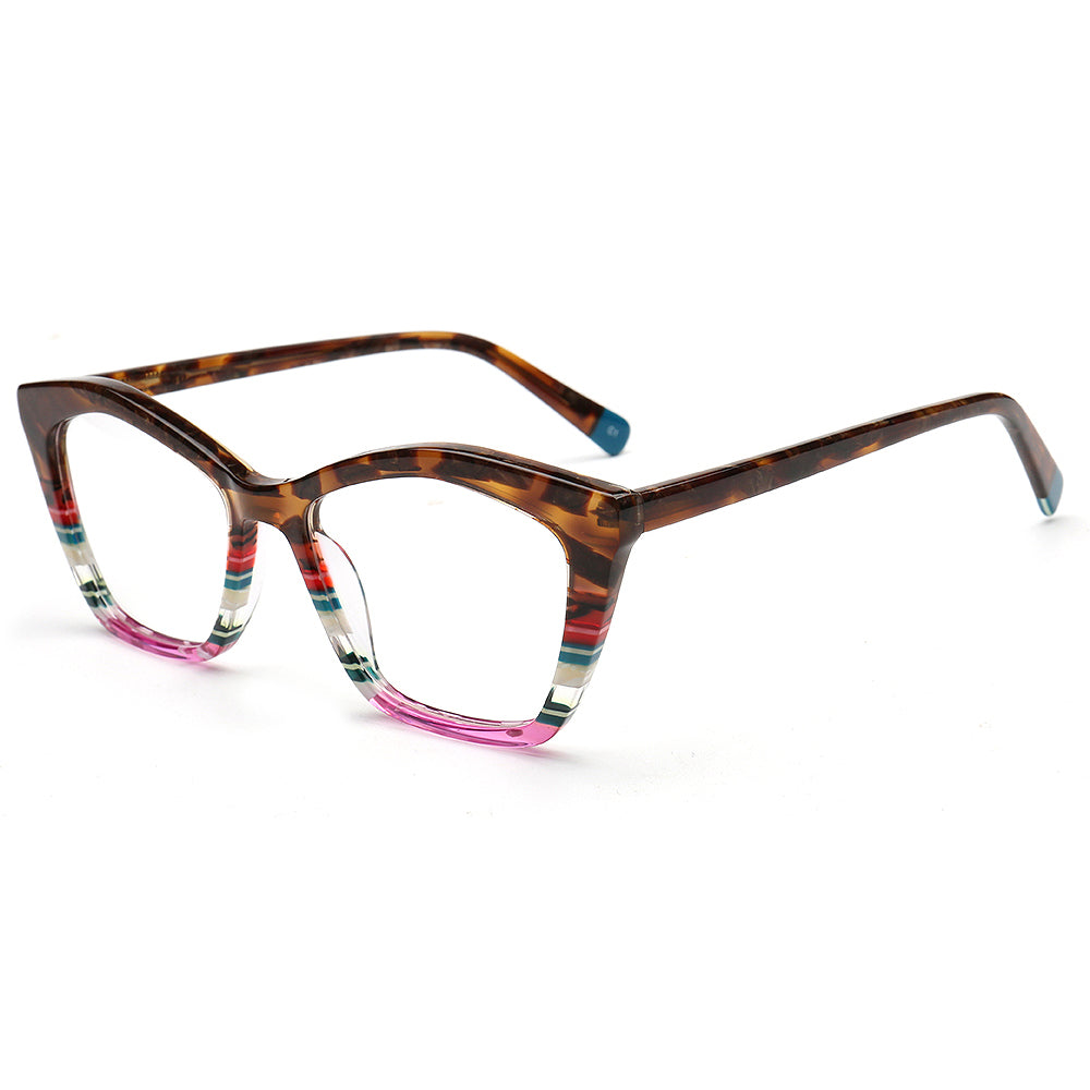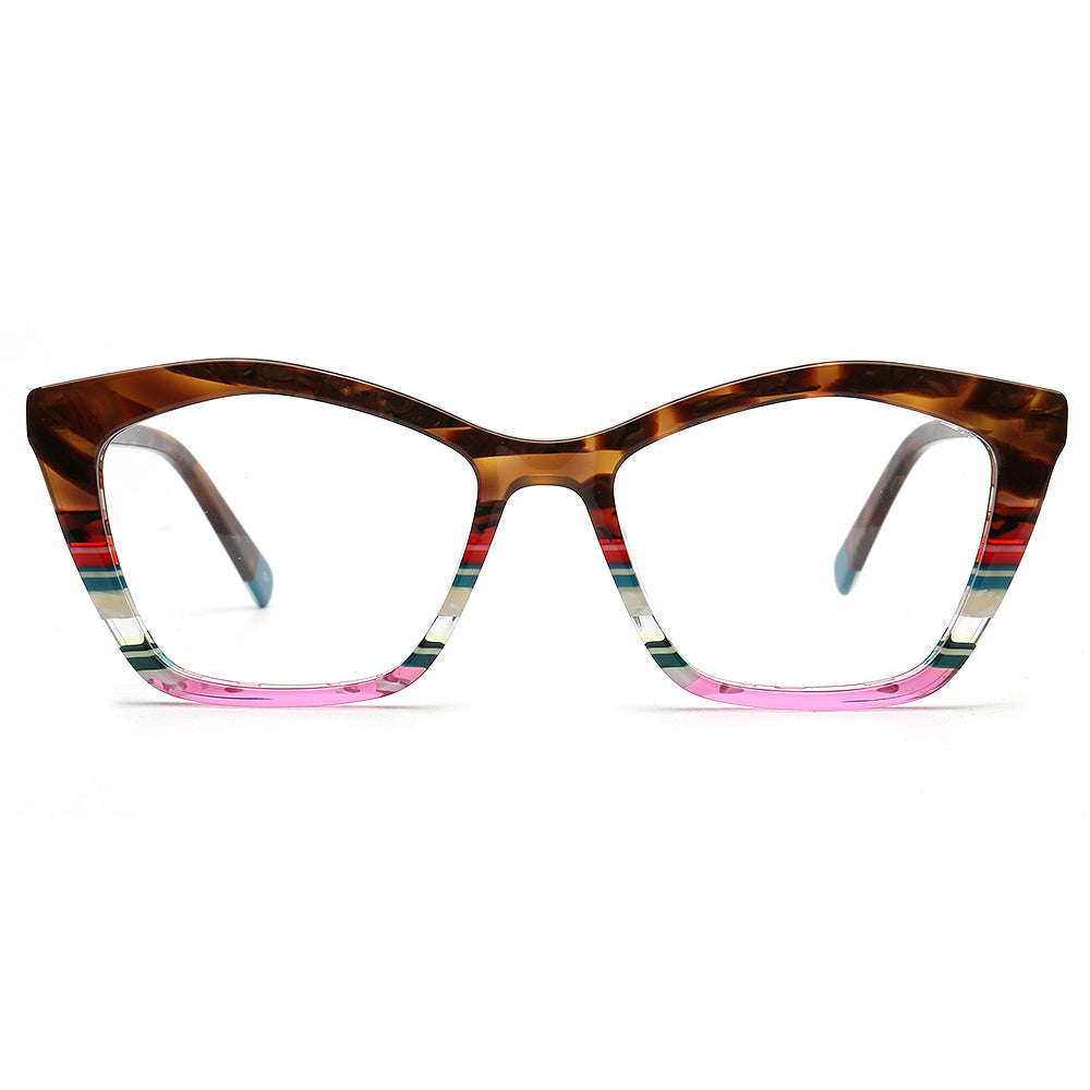 These fashionable cat eye spectacles are made of acetate material. Durability is a significant factor when choosing eyeglasses frames, and acetate frames do not disappoint. The material's strength means it can withstand daily wear and tear, reducing the need for frequent replacements. These chic eyeglasses frames come in striped design with multicolor color options. The trendy cat eye and colorful design allows these eyeglass frames to be worn by women of any ages.