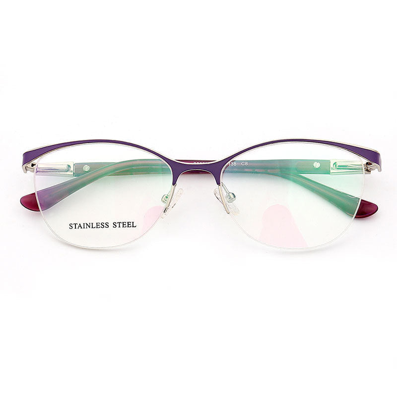 These half rim eyeglasses are made of stainless steel material. They come in black, brown, red, and purple color options. The round semi rimless design makes these most suitable for women.