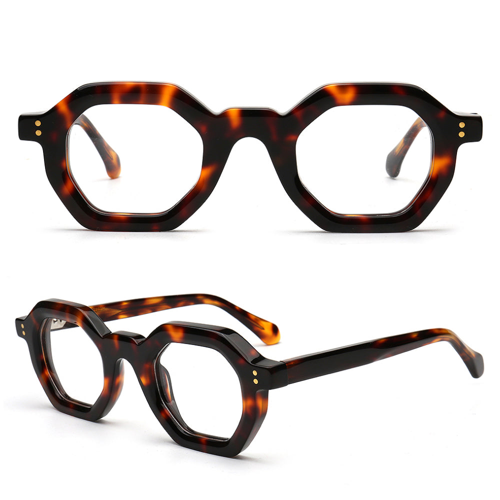 These geometric stylish eyeglass frames are made of acetate material. Durability is a significant factor when choosing eyeglasses frames, and acetate frames do not disappoint. The material's strength means it can withstand daily wear and tear, reducing the need for frequent replacements. These chic spectacles come in black, tortoise, grey, brown and blue color options. The old school geometric shape allows these glasses frames to be worn by both men and women.
